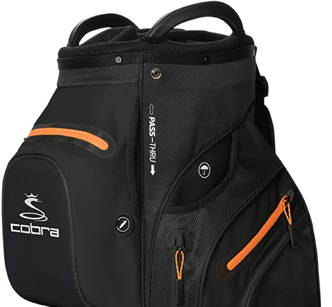 The NEW Cobra UltraDry Pro Cart Bag is a lightweight compact bag made with 100% polyester weighing 5.3 lbs and most importantly waterproof for them brave golf days in the harsh weathers. This bag fits most carts and doesn’t create any struggle to get in place and doesn’t have any pockets covered by straps making it stress free.