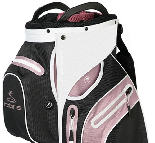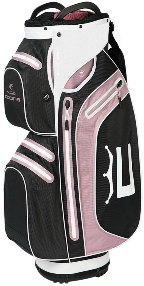 The NEW Cobra UltraDry Pro Cart Bag is a lightweight compact bag made with 100% polyester weighing 5.3 lbs and most importantly waterproof for them brave golf days in the harsh weathers. This bag fits most carts and doesn’t create any struggle to get in place and doesn’t have any pockets covered by straps making it stress free.