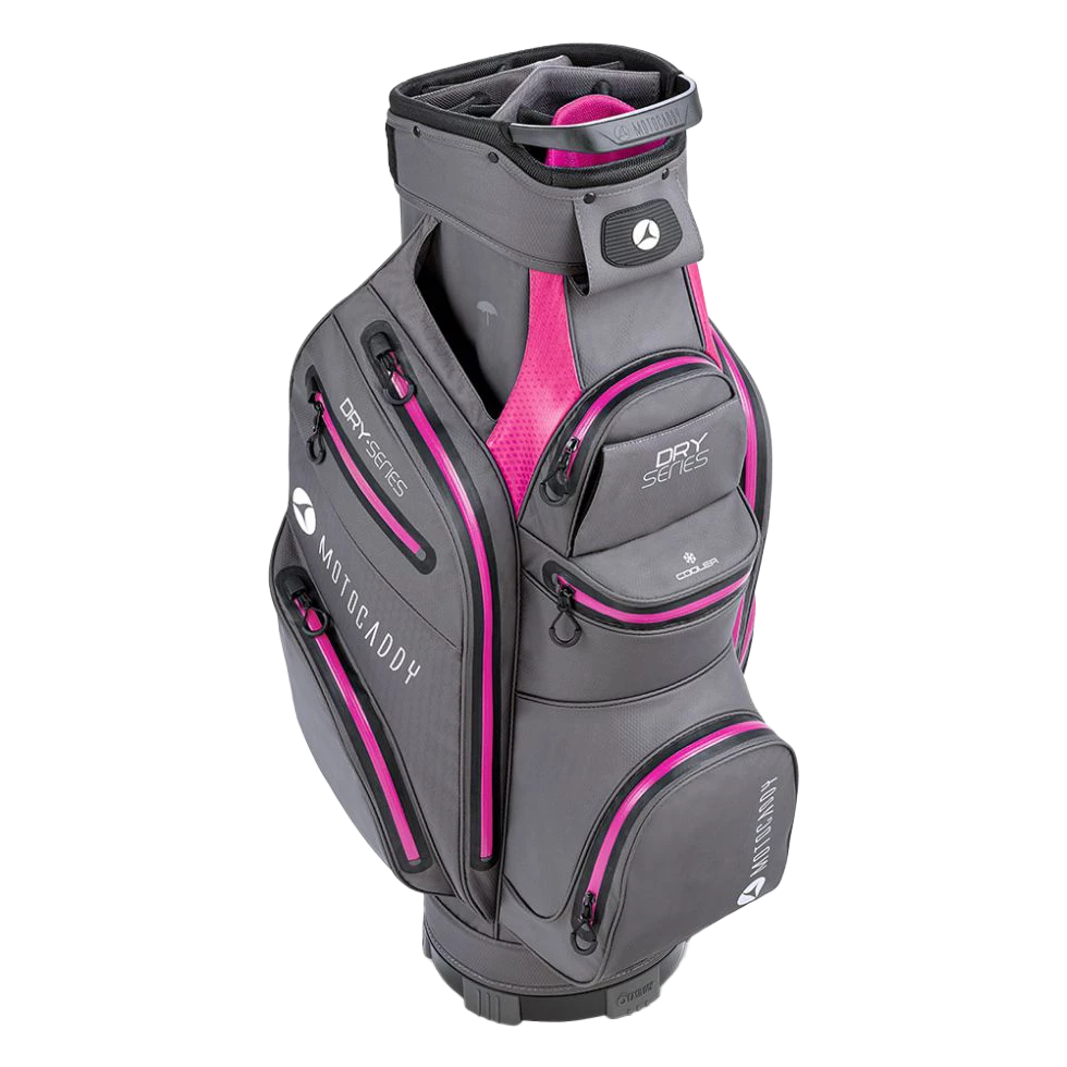 The Motocaddy Dry Series Cart Bag in  Charcoal/Fushia is a super‑lightweight and waterproof, the all-new Dry‑Series combines spacious pockets, an internal umbrella holder and the best zips on the market for smooth, snag free opening. It also features a removable flap to allow club cresting.