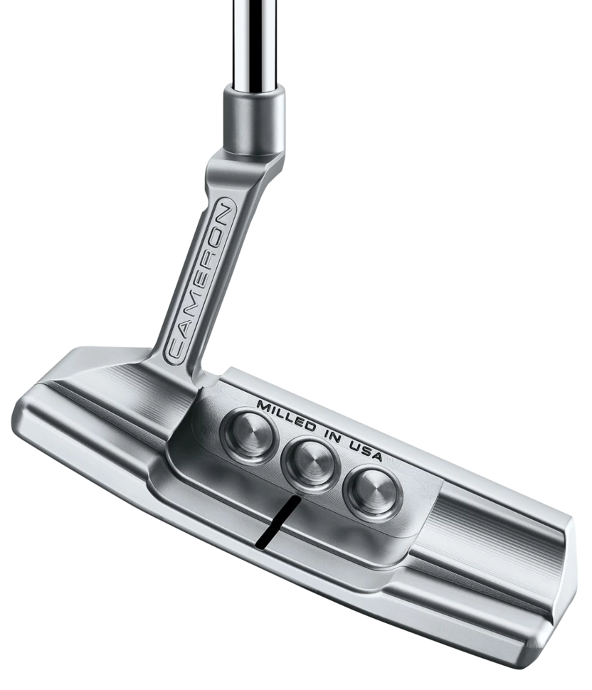 The Super Select Newport 2.5 Plus Putter from Scotty Cameron comes with the same MOI-enhancing head shape as the Super Select Newport 2 Plus, the Super Select Newport 2.5 Plus adds Scotty’s new sculpted I-beam-style jet neck to promote additional toe flow in the putting stroke. With the wider flange, this is another tour-inspired shape that introduces the next profile in high-performance blade design. Milled in USA from 303 stainless steel with a solid face and the line’s dual-milled face technology, the Newport 2.5 Plus has an integrated 6061 aircraft grade aluminum sole plate, anodized clear and engraved with the line’s graphics. A milled flange sight line provides clean alignment, while customizable stainless steel sole weights provide balance. The putter includes the line’s new shaft band, headcover and textured Pistolini Plus grip.