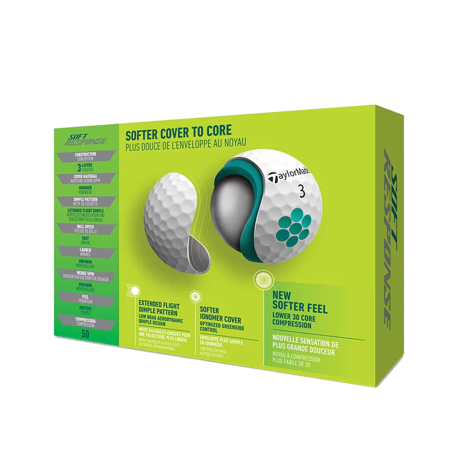 New low 30 compression core and softer ionomer cover (50 compression overall) make Soft Response our softest ball.